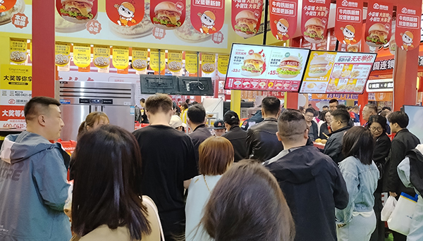 充滿鍋氣的鐵板漢堡制作過程,吸引了眾多參展觀眾的駐足。無論是面包胚的口感,還是牛肉餅的質量與口味都獲得了一致的好評。顏值超高、口味超棒、多種搭配、健康不貴的福咔恰漢堡深受眾多參展觀眾的喜愛,場館內人手一個的福咔恰漢堡就是參展觀眾對于品牌最高的肯定。